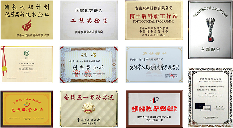 全國五一勞動獎狀;國家創(chuàng)新型企業(yè);中國創(chuàng)新型企業(yè)100強;中國包裝龍頭企業(yè);中國包裝優(yōu)秀示范品牌;國家首批資源節(jié)約型環(huán)境友好型試點企業(yè);全國就業(yè)與社會保障先進民營企業(yè);國家火炬計劃重點高新技術(shù)企業(yè);中國中小企業(yè)板上市公司50強;全國守合同重信用企業(yè);全國先進包裝企業(yè);全國企事業(yè)單位知識產(chǎn)權(quán)試點單位;全國輕工業(yè)先進卓越績效企業(yè);海關(guān)AA級企業(yè);中國醫(yī)藥包裝優(yōu)秀單位;安徽省人民政府質(zhì)量獎提名獎